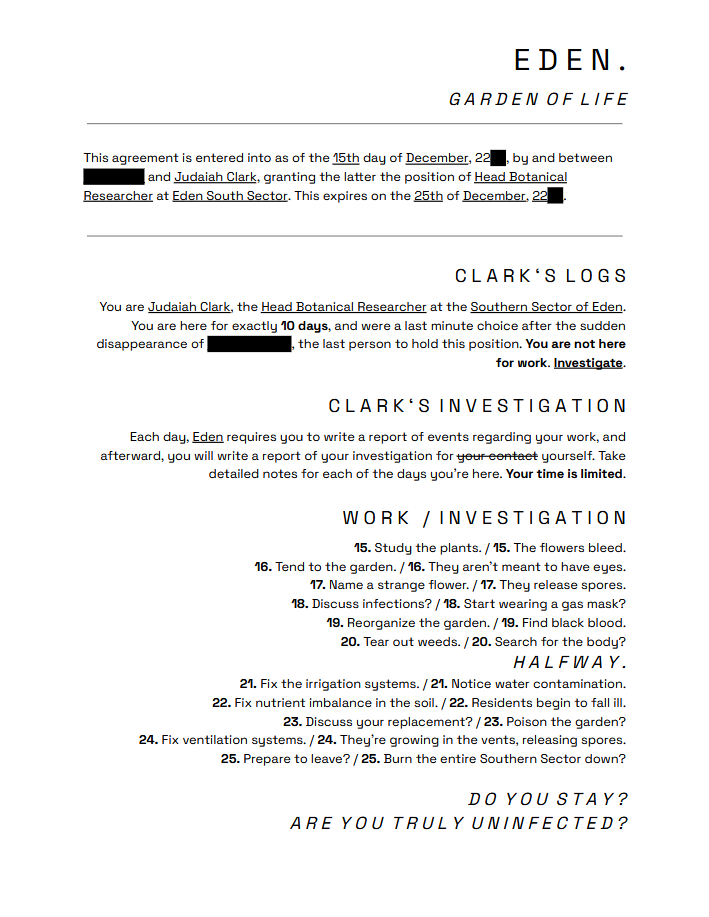 You are Judaiah Clark, the Head Botanical Researcher at the Southern Sector of Eden. You are here for exactly 10 days, and were a last minute choice after the sudden disappearance of ■■■■■■ ■■■■■, the last person to hold this position. You are not here for work. Investigate.